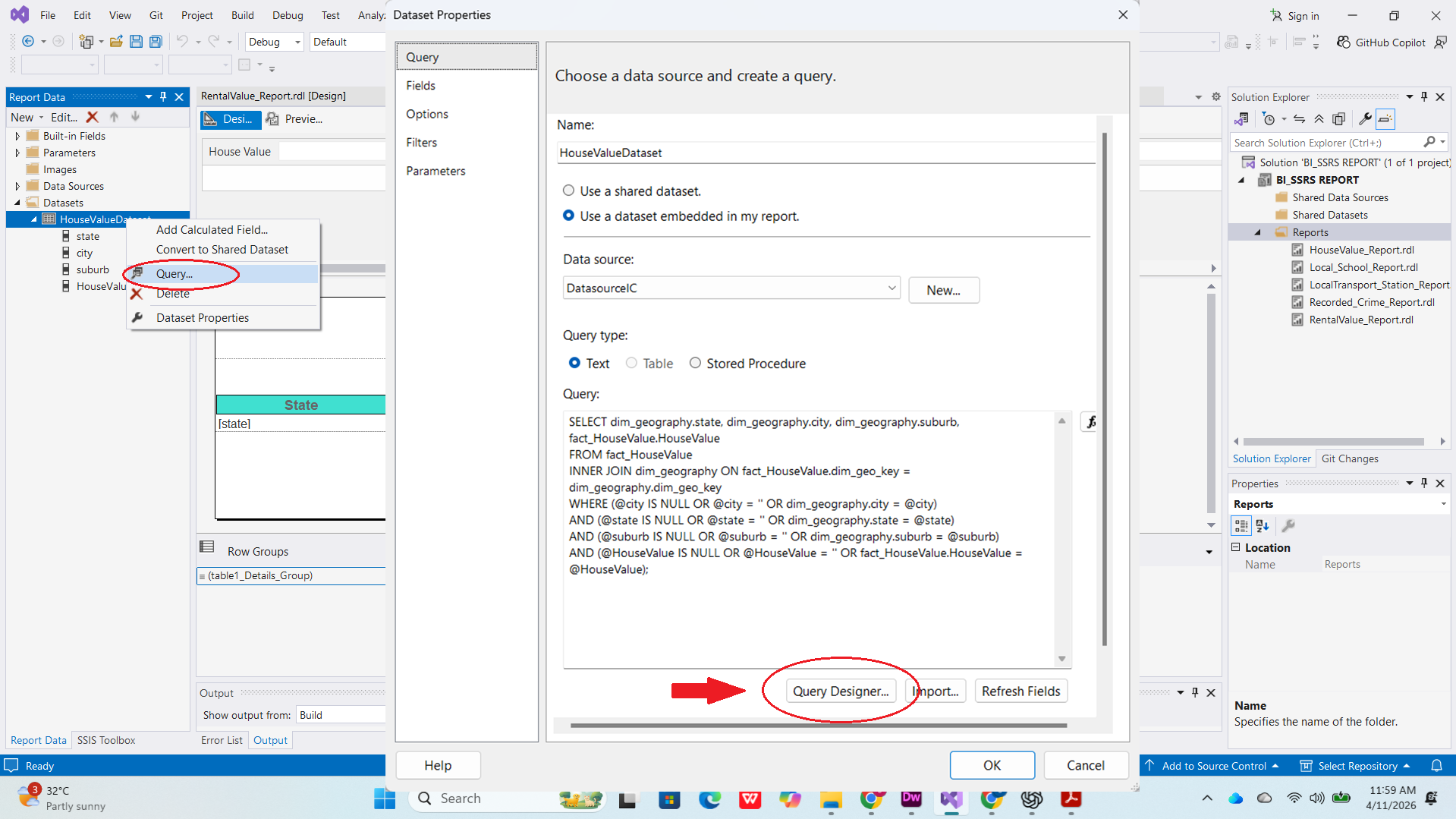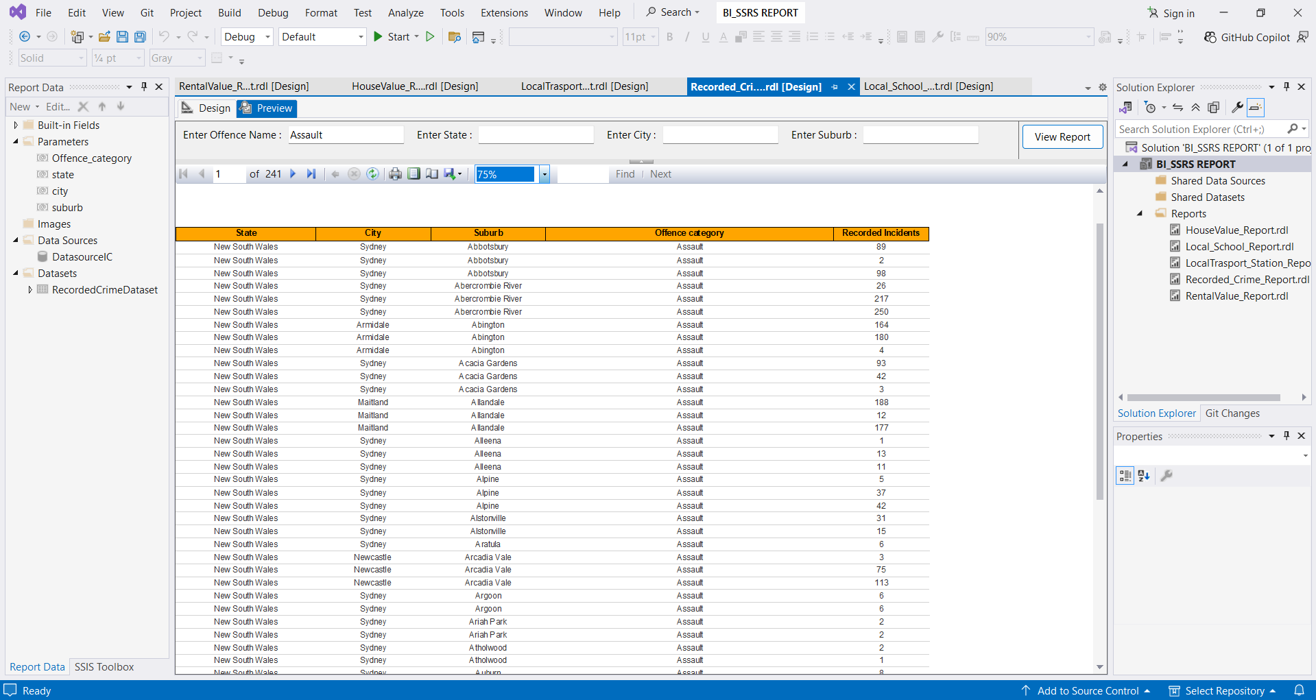 In designing my SSRS Report, I incorporated key parameters, primarily location-based filters such as state, city, and suburb, along with monetary values and crime-related data using the Query designer.